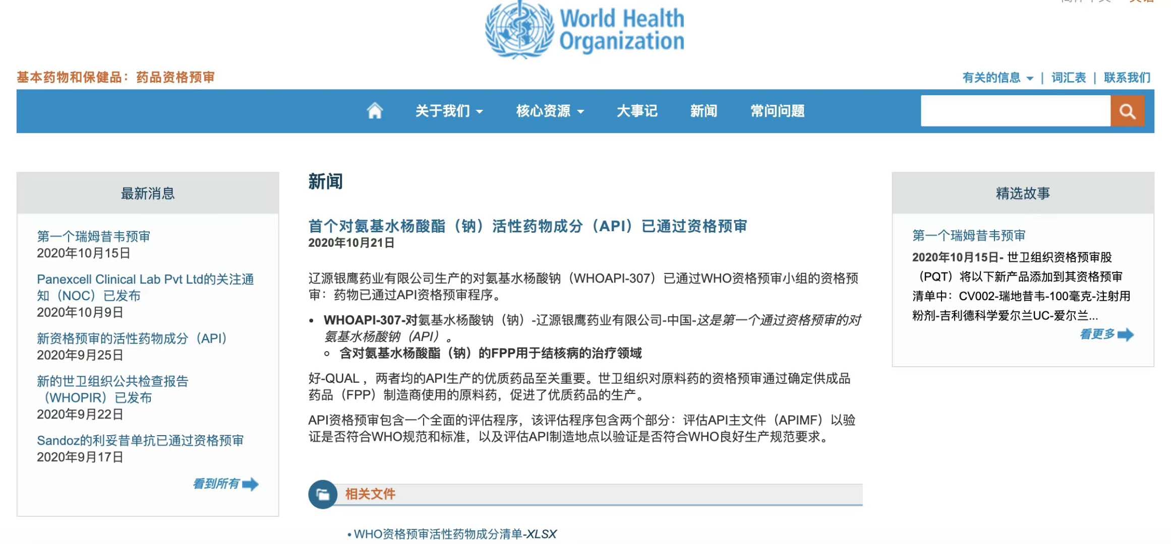 2020年10月8日,值此雙節(jié)到來(lái)舉國(guó)歡慶的假日最后一天,遼源銀鷹制藥收到來(lái)自WHO世界衛(wèi)生組織的來(lái)信,公司品種“對(duì)氨基水楊酸鈉”正式通過(guò)WHO認(rèn)證注冊(cè)...